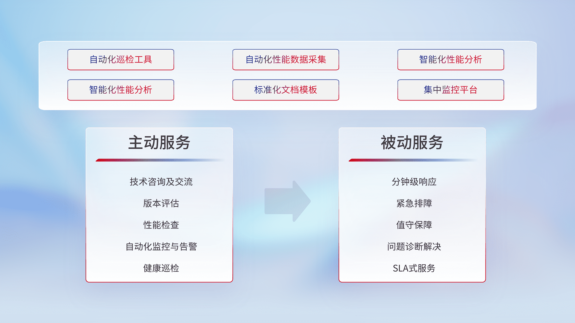 智能化工具和标准化文档,,保障服务质量,,,,提供主动服务(包含技术咨询、、、、版本评估、、、、性能检查、、、、自动化监控与告警、、、、健康巡检)和被动服务包含(分钟级响应、、、、紧急排障、、、、值守保障、、问题诊断解决、、、SLA服务)。。